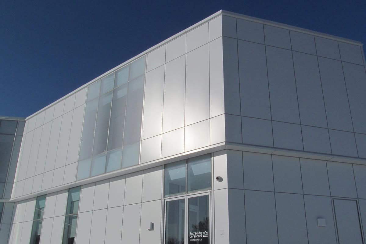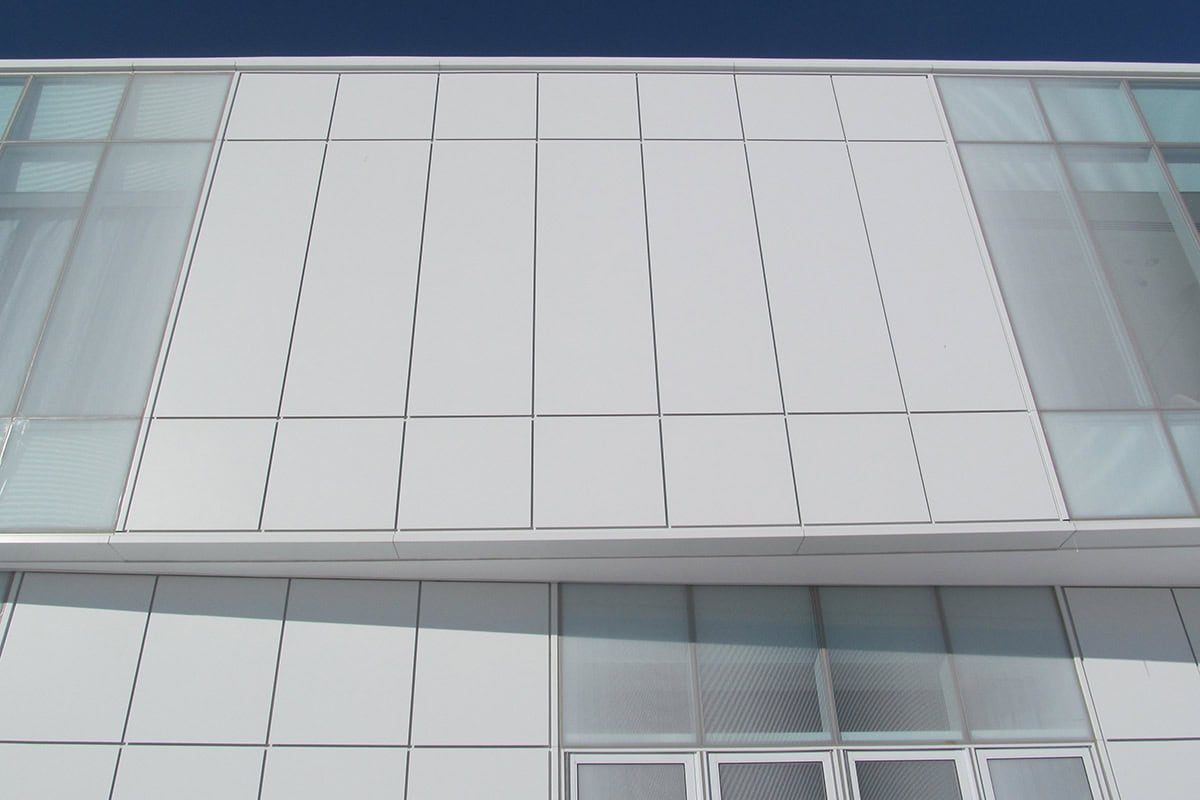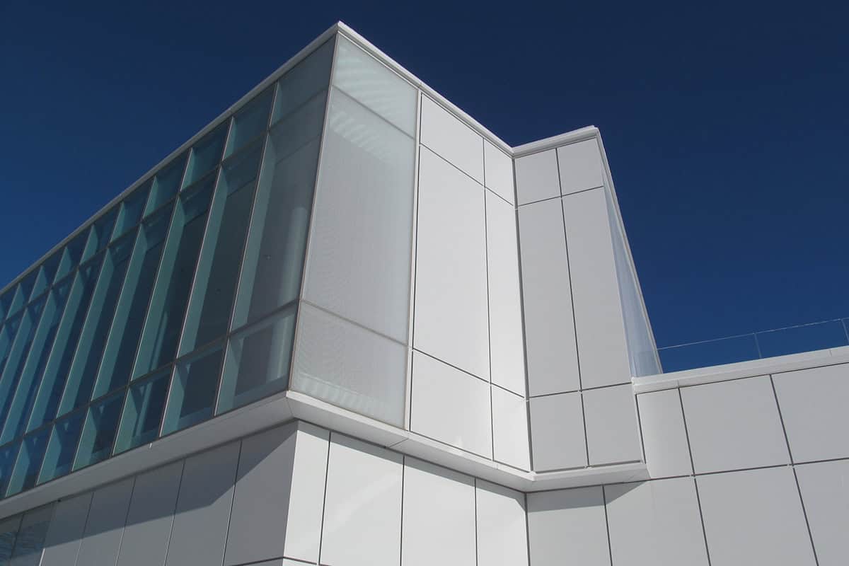 Pour cet agrandissement majeur de la bibliothèque municipale, couleur spéciale d’un blanc « immaculé », panneaux de type PP-400 Panfab Plaque en très grands formats !