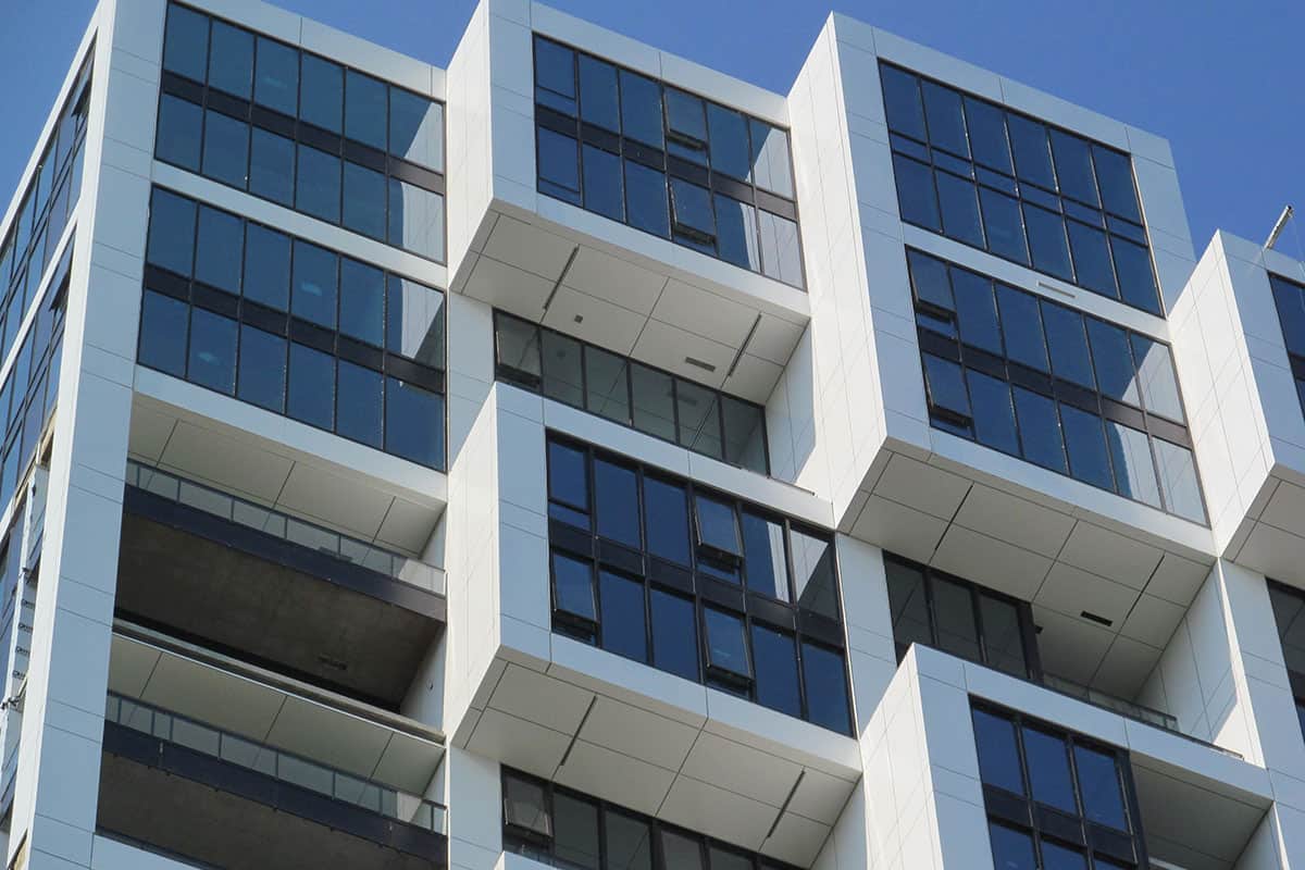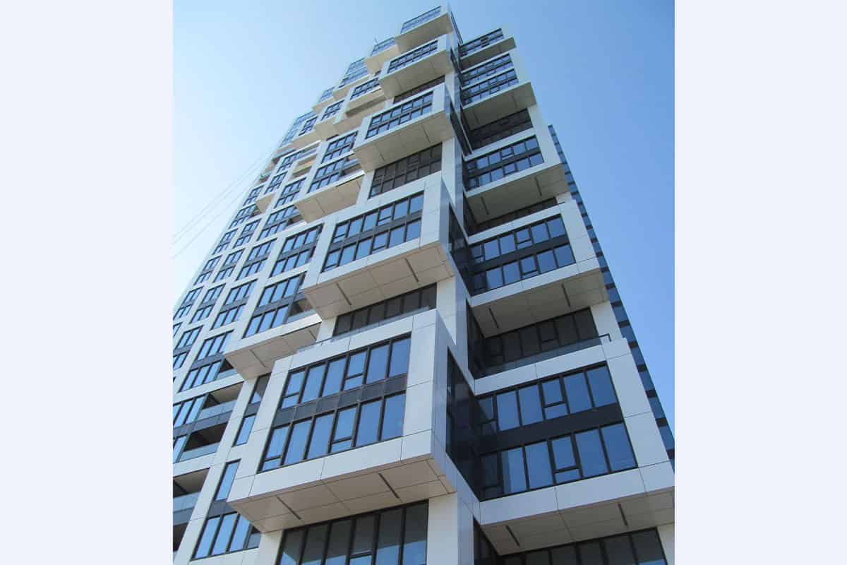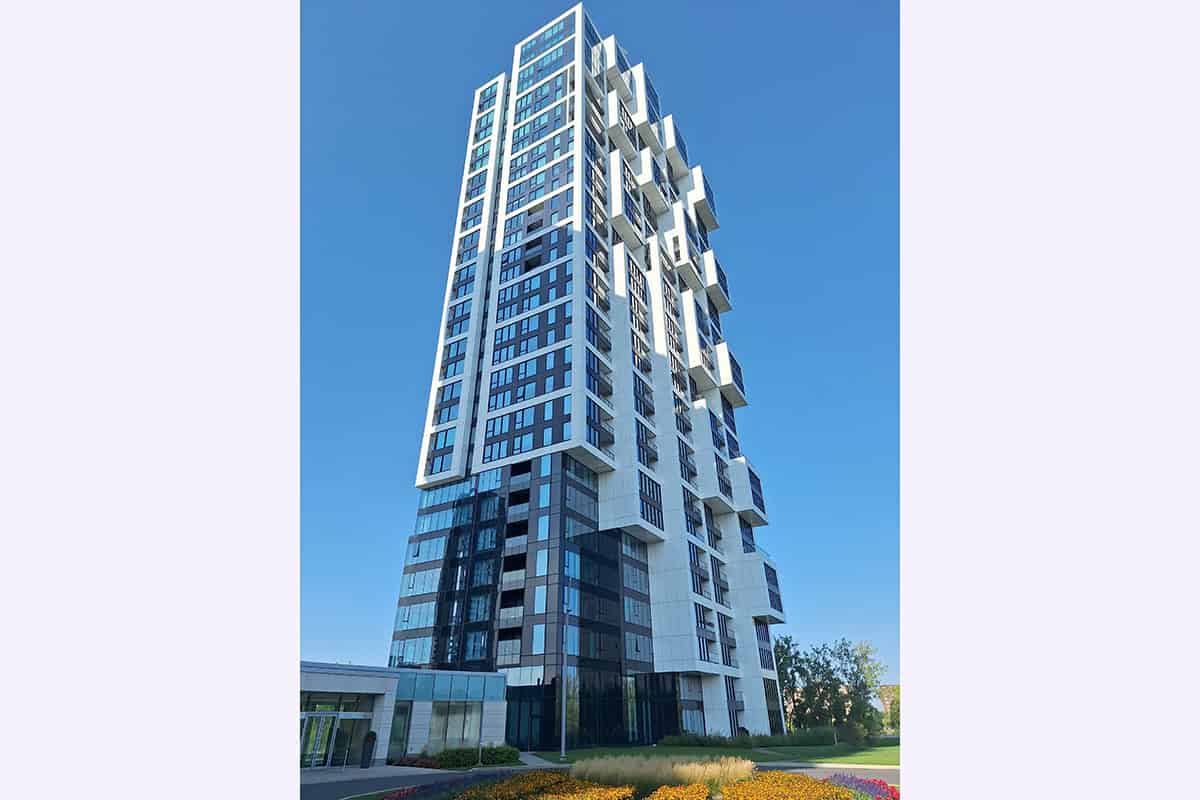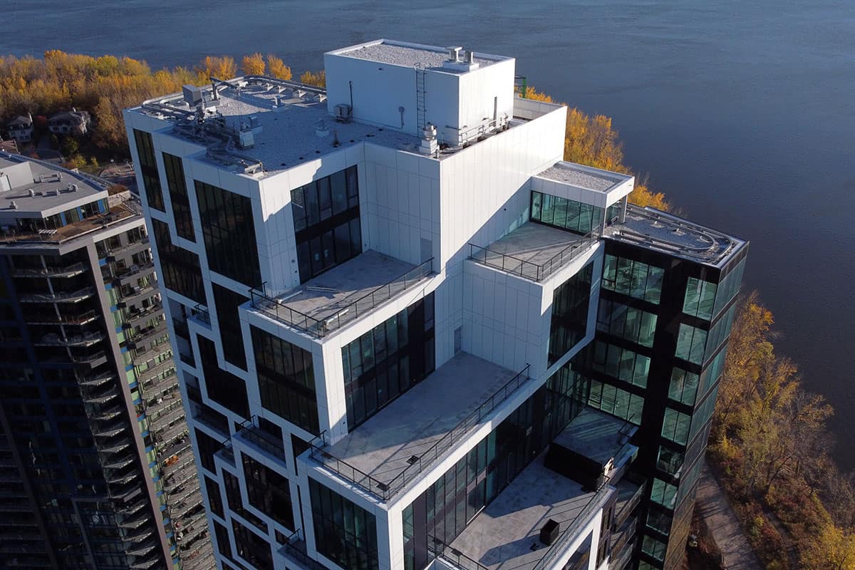 Pour cette prestigieuse tour multi-résidentielle de 32 étages à l’Île-des-Sœurs, au design de cubes : utilisation du type PP-400 Panfab Plaque en fini prépeint D-MAX tel duranar XL couleur spéciale blanc RAL9003 = une couleur spéciale pour une tour spéciale !