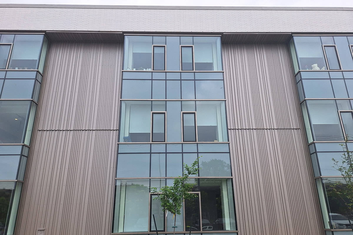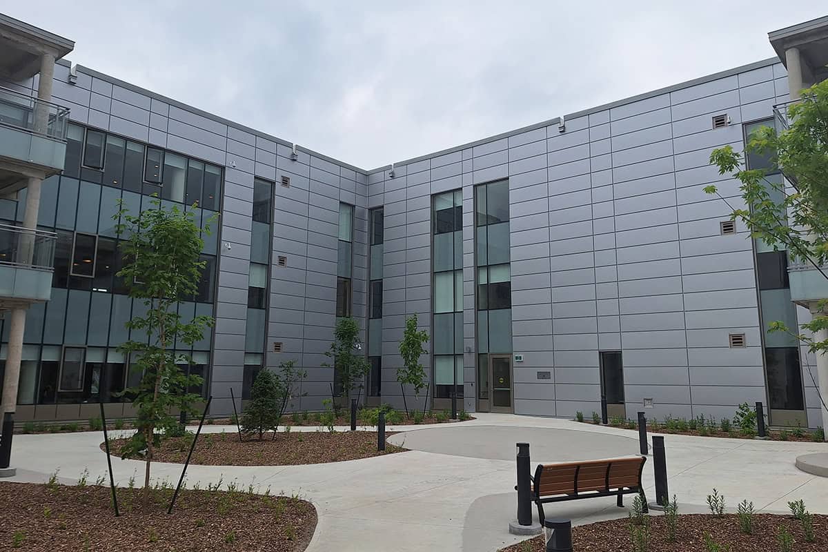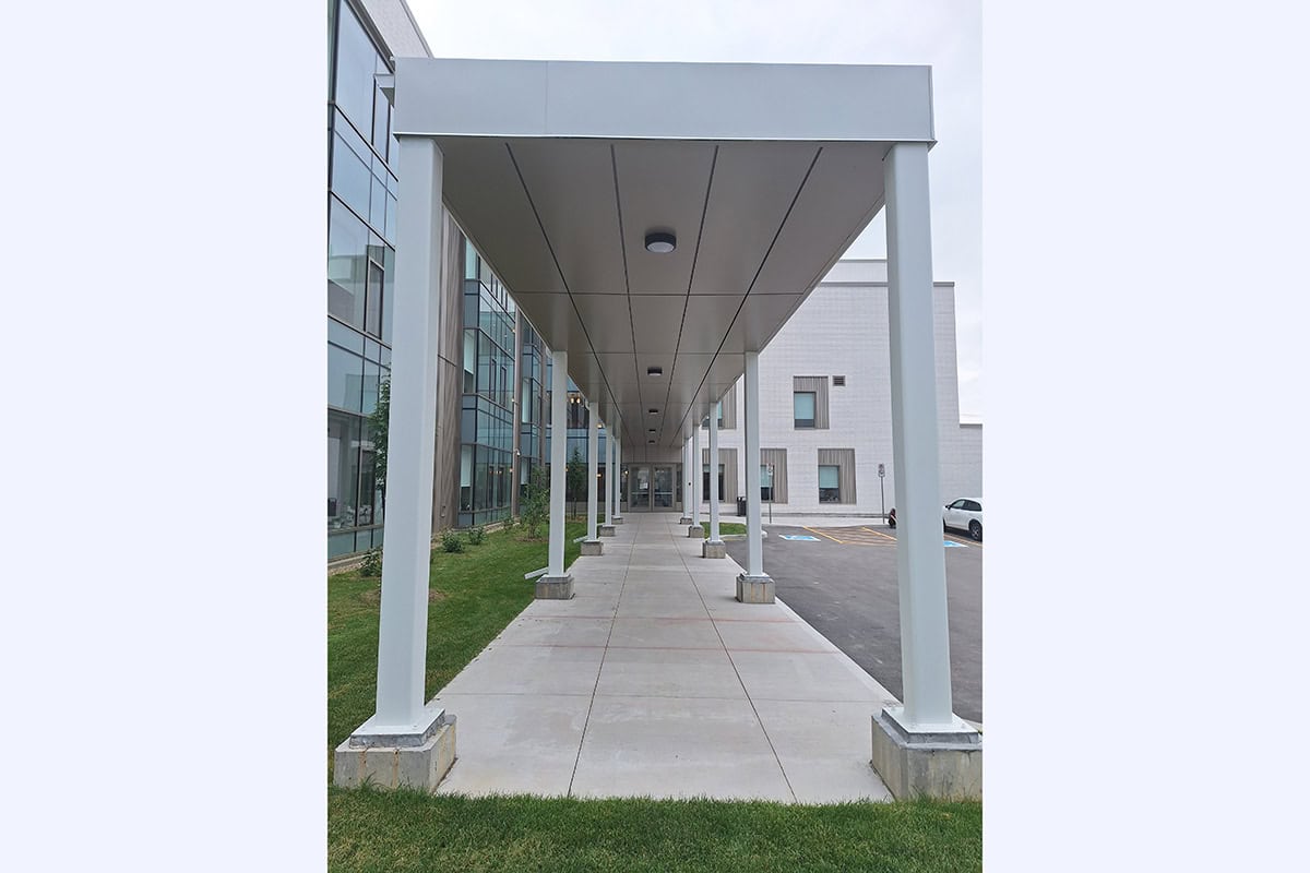 La cour intérieure avec des panneaux de type PS-200 Panfab Standard et le soffite de la marquise extérieure avec des panneaux de type PP-400 Panfab Plaque.