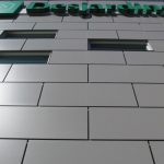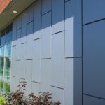 Pour cet autre projet de Caisse Desjardins, nous avons fournis principalement le type PP-400 Panfab Plaque en alum peint uréthane acrylique, couleur gris pâle tel RAL7040; installé horizontalement et verticalement en quinquonce à demie.
