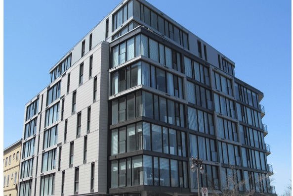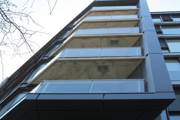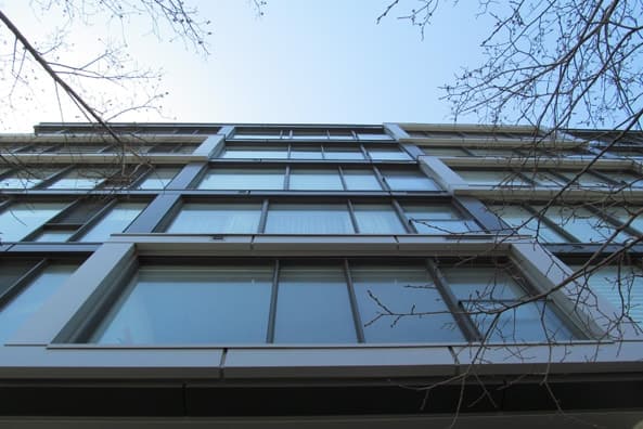 Pour ce projet prestigieux de condominiums haut-de-gamme : un design de panneaux linéaires des entre-fenetres, en bandeaux et en reliefs, utilisé en deux couleurs, soit « rigel-2 » et « alpha centauri ».