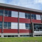 Pour la réfection murale de cette école, recouvrement avec type PS-200 Panfab Standard, dont demi-colonnes juxtaposées réalisées en « U » pour l’entrée principale et insérés aux murs, en couleurs fusain; et grands panneaux muraux aux entres-fenêtres, en couleur jupiter.