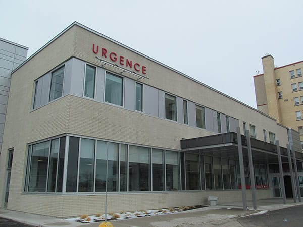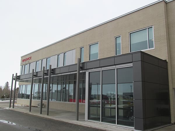 Pour agrandissement et rénovation de l’urgence de cet hôpital régional, utilisation de type PP-400 Panfab Plaque, dont avec couleur RAL9006, pour grand mur et marquise de l’entrée de l’urgence.