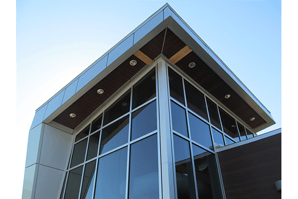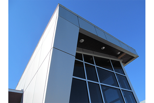 Pour ce poste de la Sureté du Québec de la MRC Beauharnois-Sallaberry-de-Valleyfield, panneau en recouvrement de l’entrée principale, dont colonne tronquée à angle, fascias à angle et sections murales droites.